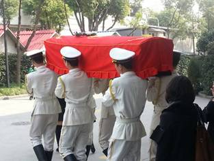 中国光学光电子行业协会秘书长王琳女士(左四)、中国光学光电子行业协会发光二极管显示应用分会理事长关积珍先生(左二)等悼念陆荣庆先生