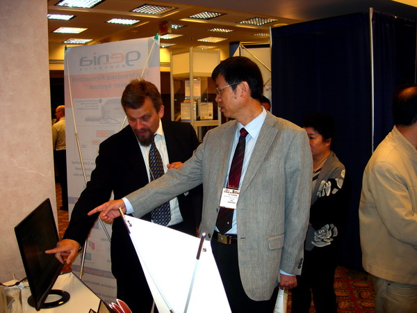 中国光协代表团团长、北京光电技术研究所副所长陆耀东先生(左二)与展商交流
